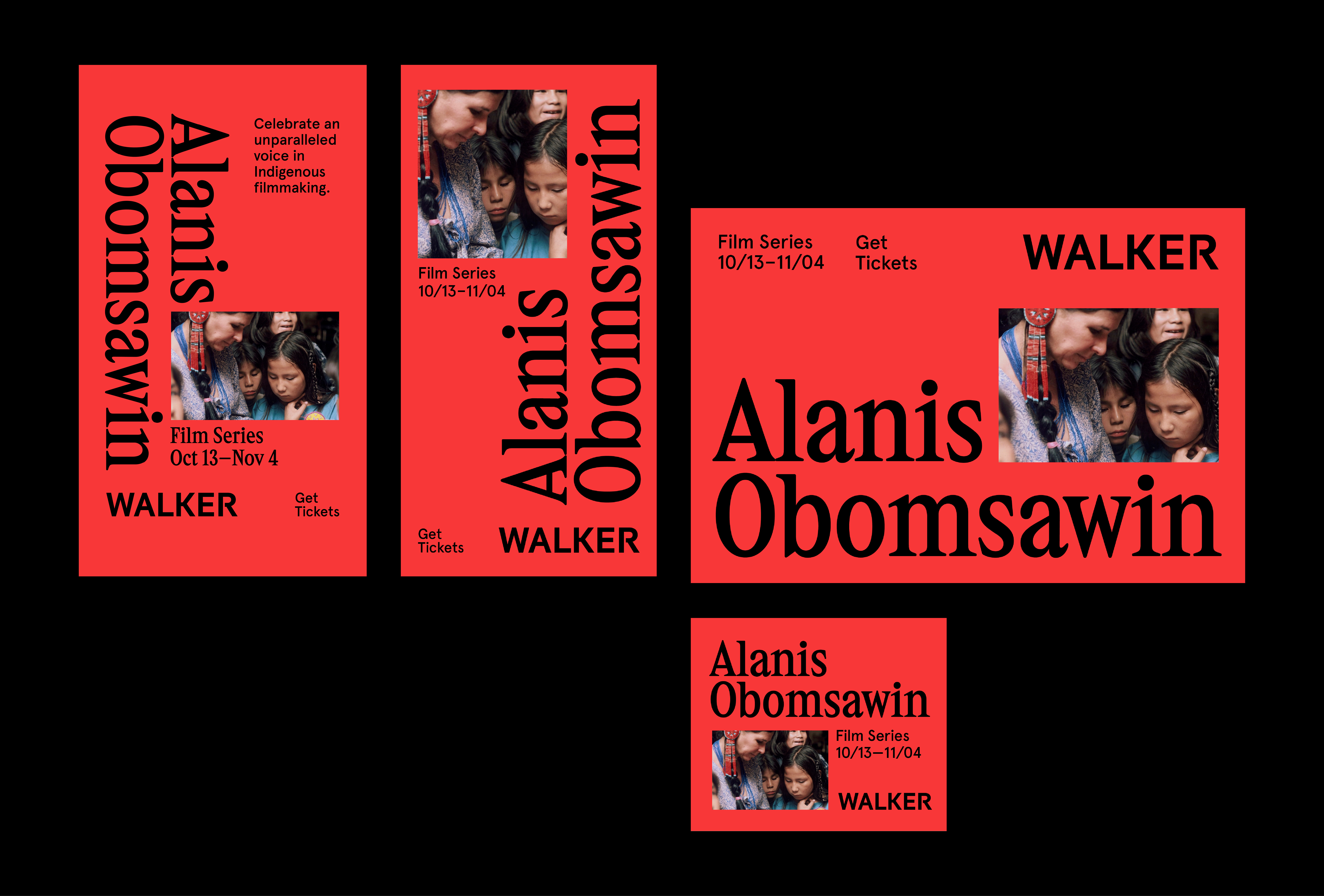 Alanis Obomsawin (Abenaki) is an unparalleled voice in documentary filmmaking. Her radical, lifelong career spans more than five decades and centers the lives and voices of Indigenous communities. At the Walker Art Center, a series of screenings showcase Obomsawin’s work and includes an in-person dialogue. The identity has a bold typography treatment for her name, enabling flexible compositions between image and text for various proportions.